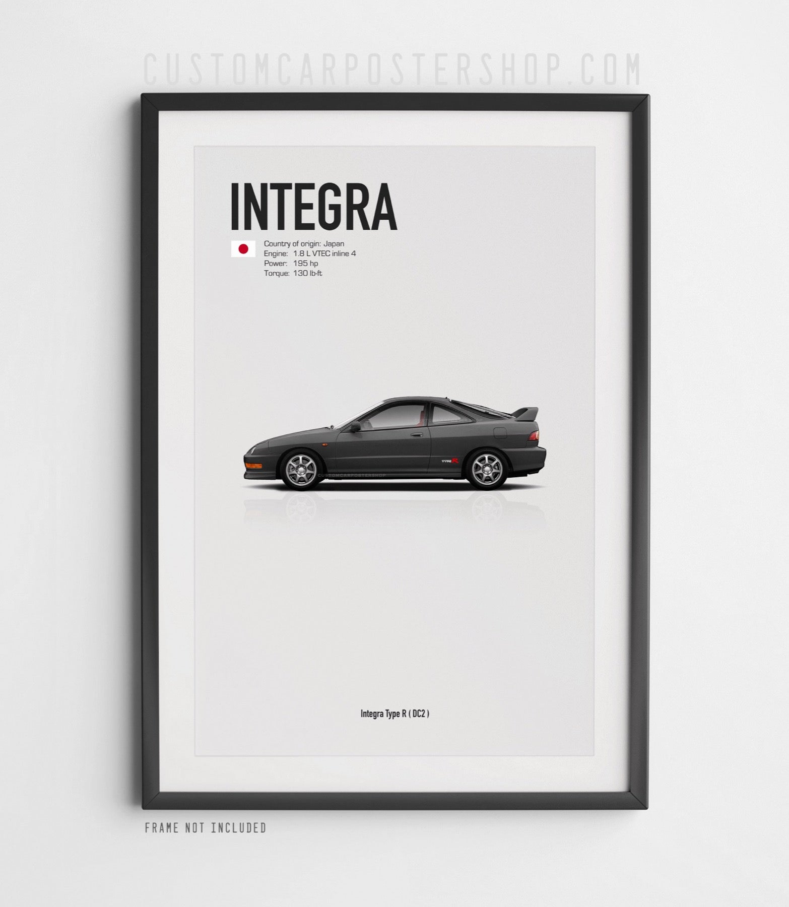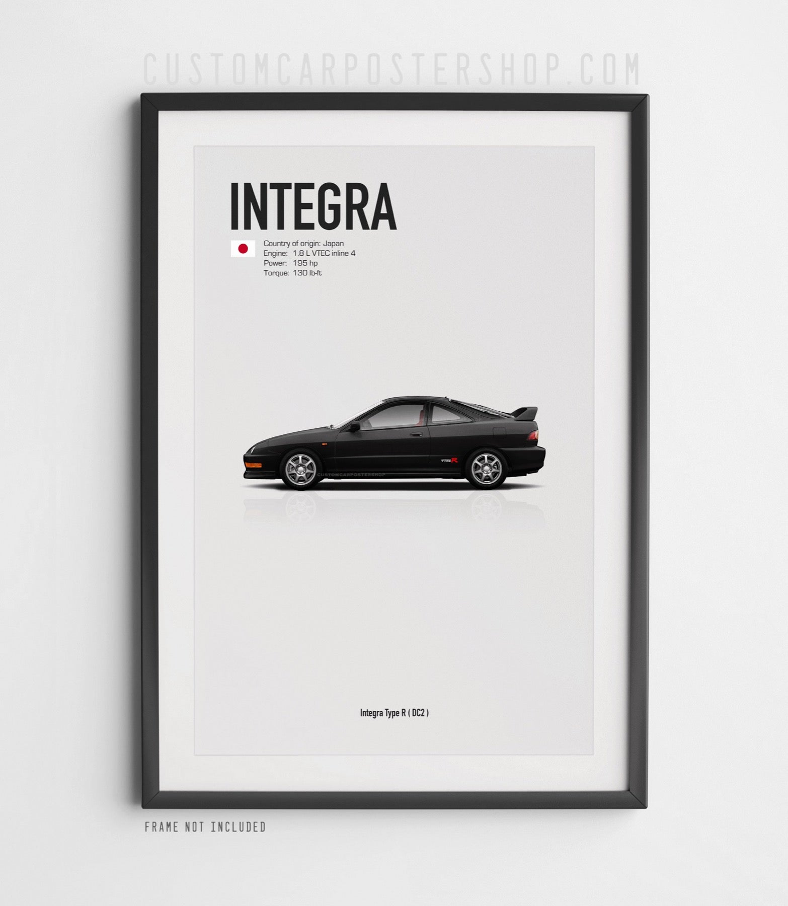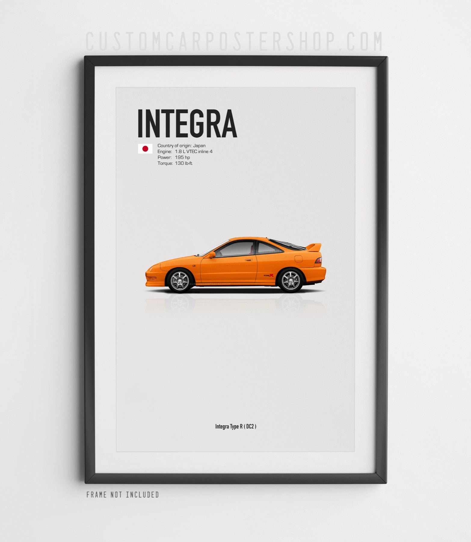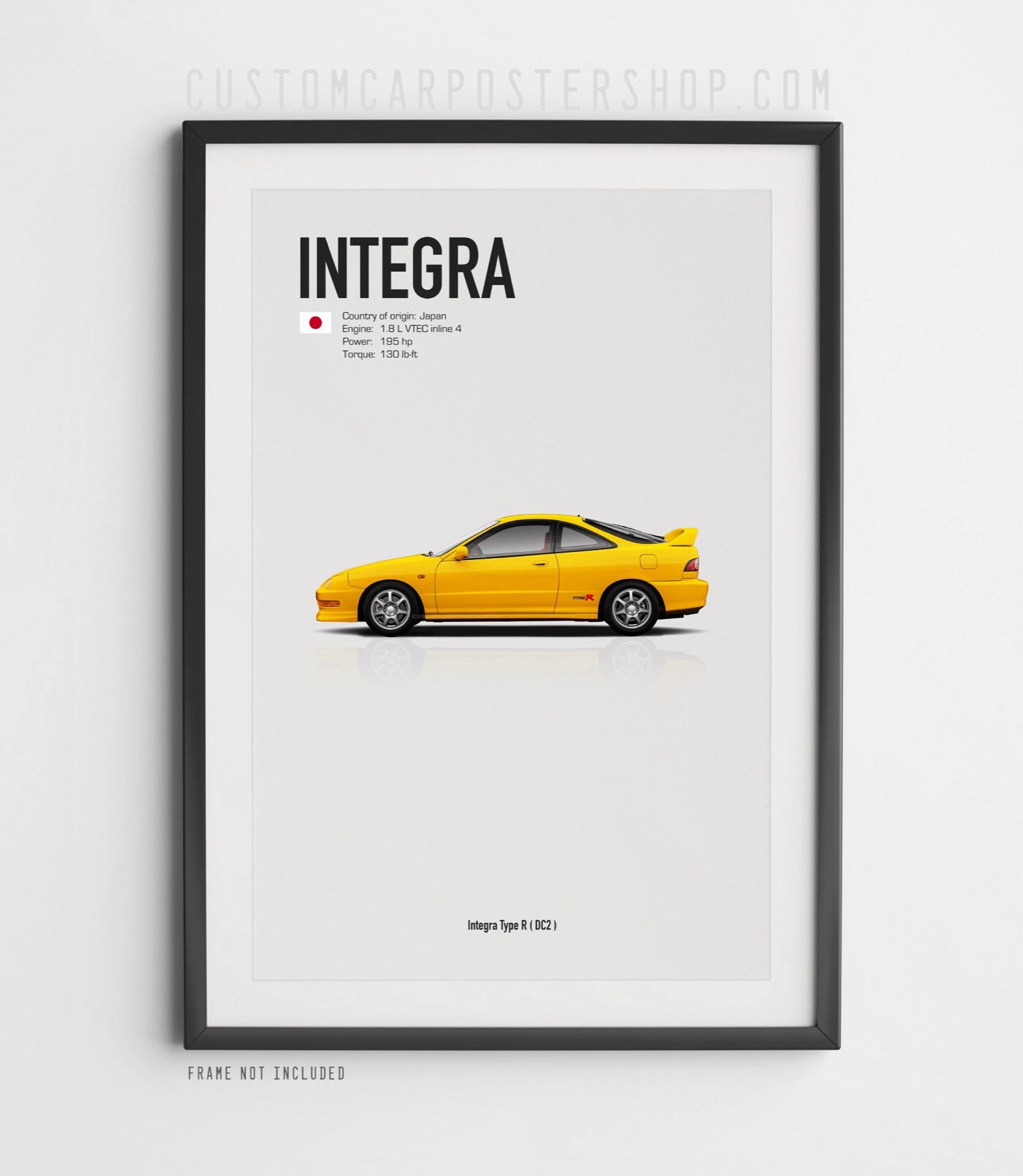 This USDM Acura Integra Type R DC2 represents one of the most respected front-wheel-drive performance cars ever built. Featuring a clean side-profile illustration on a refined white canvas, the design highlights the DC2’s lightweight proportions, purposeful stance, and motorsport-inspired heritage.