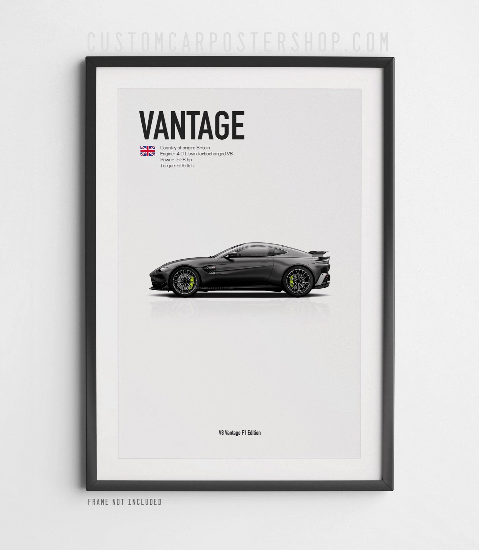 Rendered in photorealistic detail, the print showcases the Vantage F1’s aggressive aerodynamics with a larger rear wing and exclusive accents and badges.