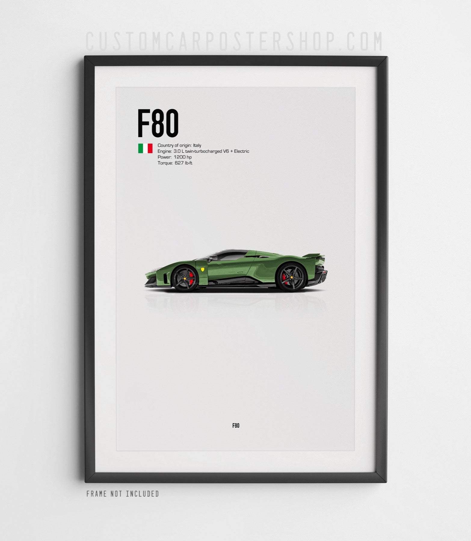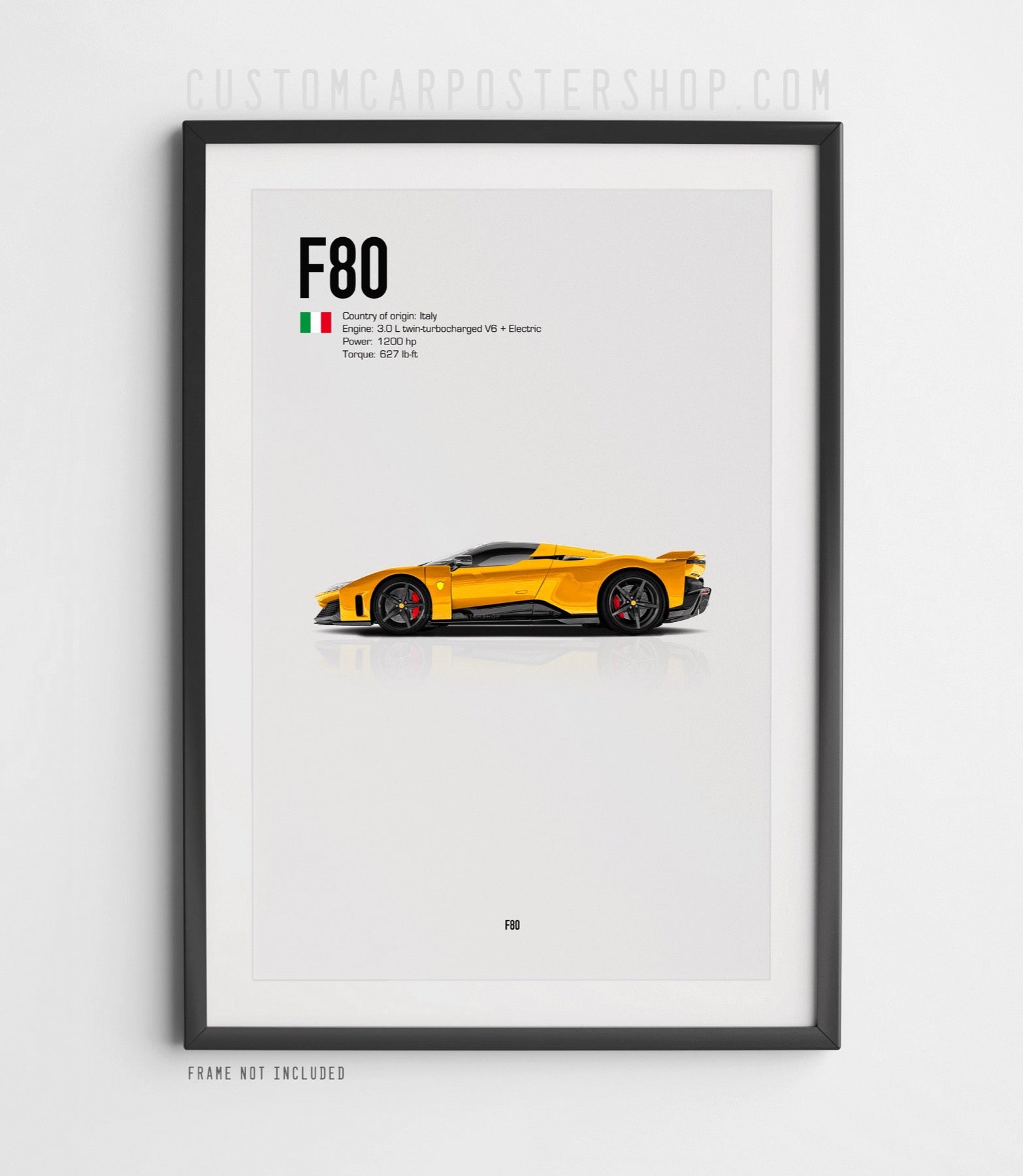This Ferrari F80 poster, created as a tribute to Ferrari’s 80th anniversary. Featuring the 1,200 hp F80 hybrid supercar, a successor to the legendary LaFerrari.