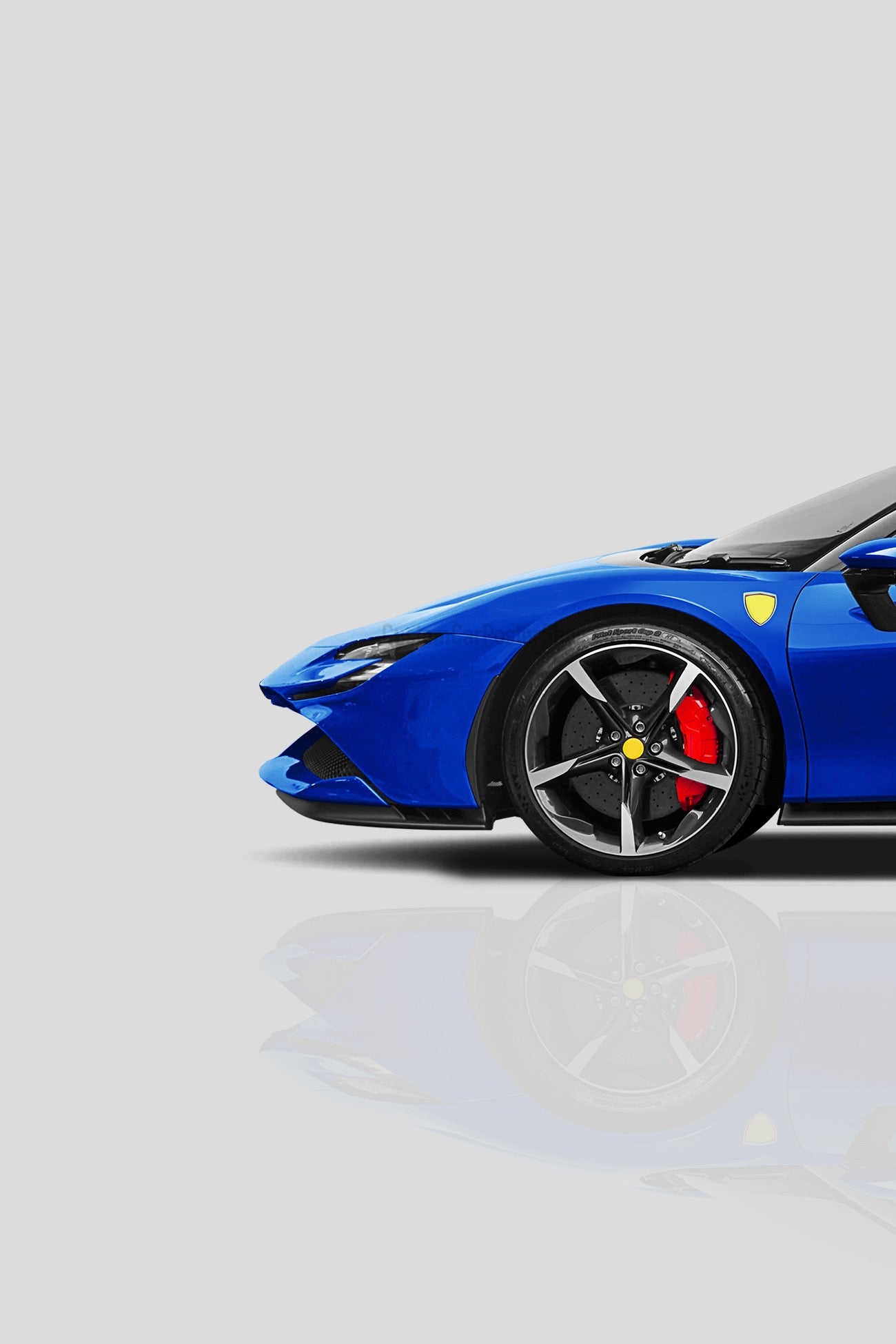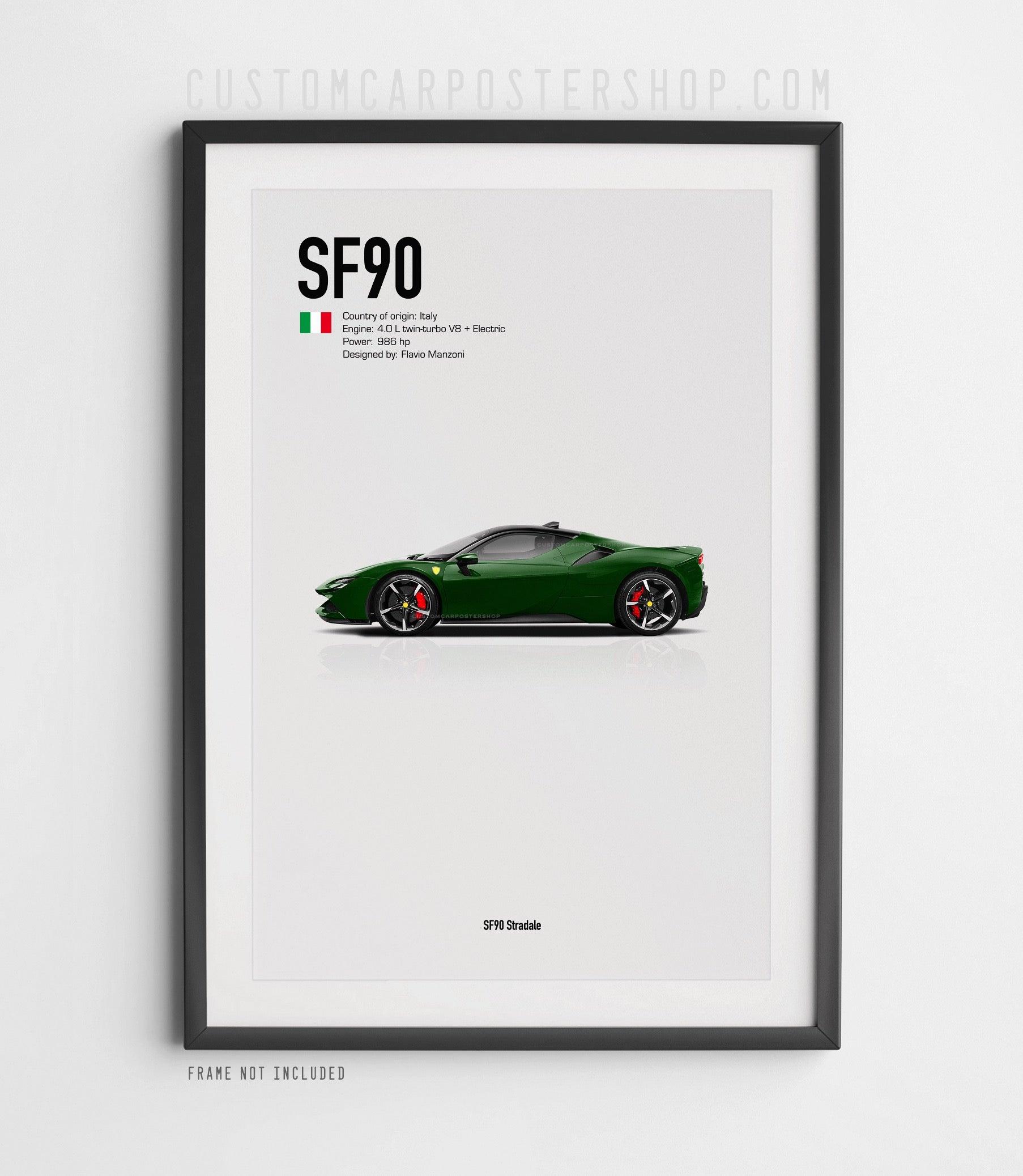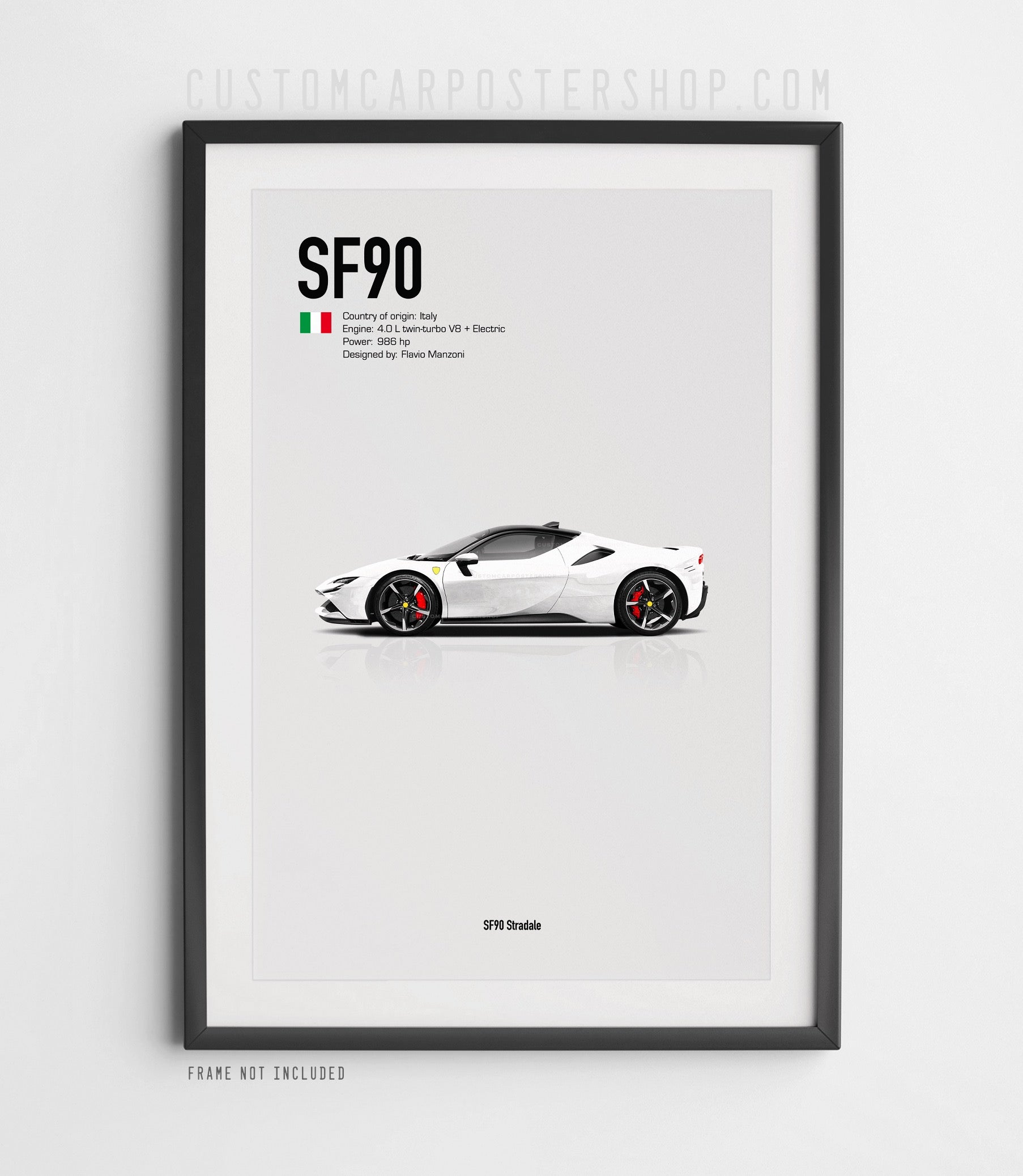This poster features the Ferrari SF90 Stradale, Ferrari's first hybrid supercar. A combined output of 986 hp means 0-60mph in 2.5 seconds!