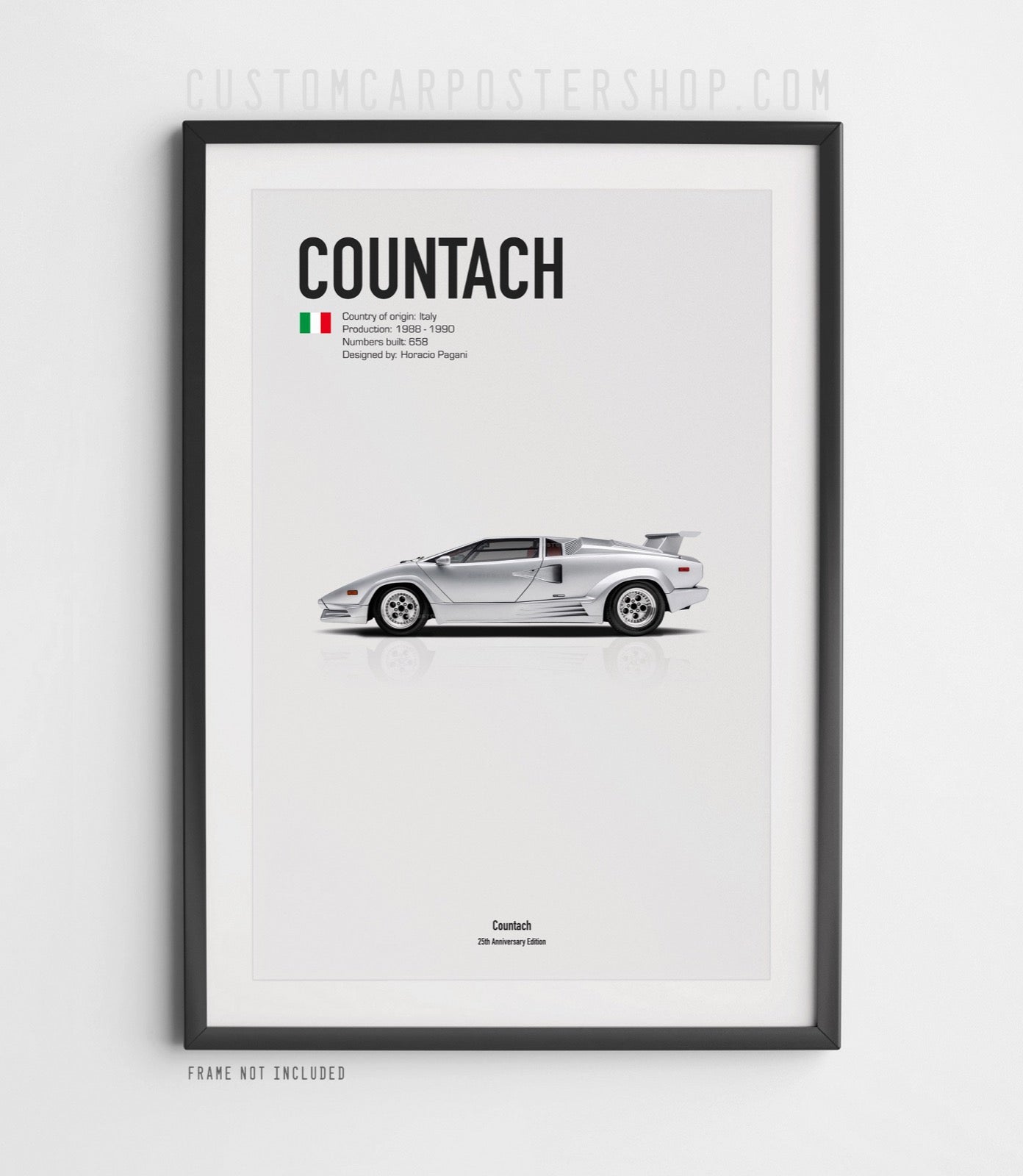 Only 658 cars were built during the short two years production between 1988 and 1990. Named to honour the company's 25th anniversary in 1988. This Wall Art features the Countach with its signature Lambo Doors.