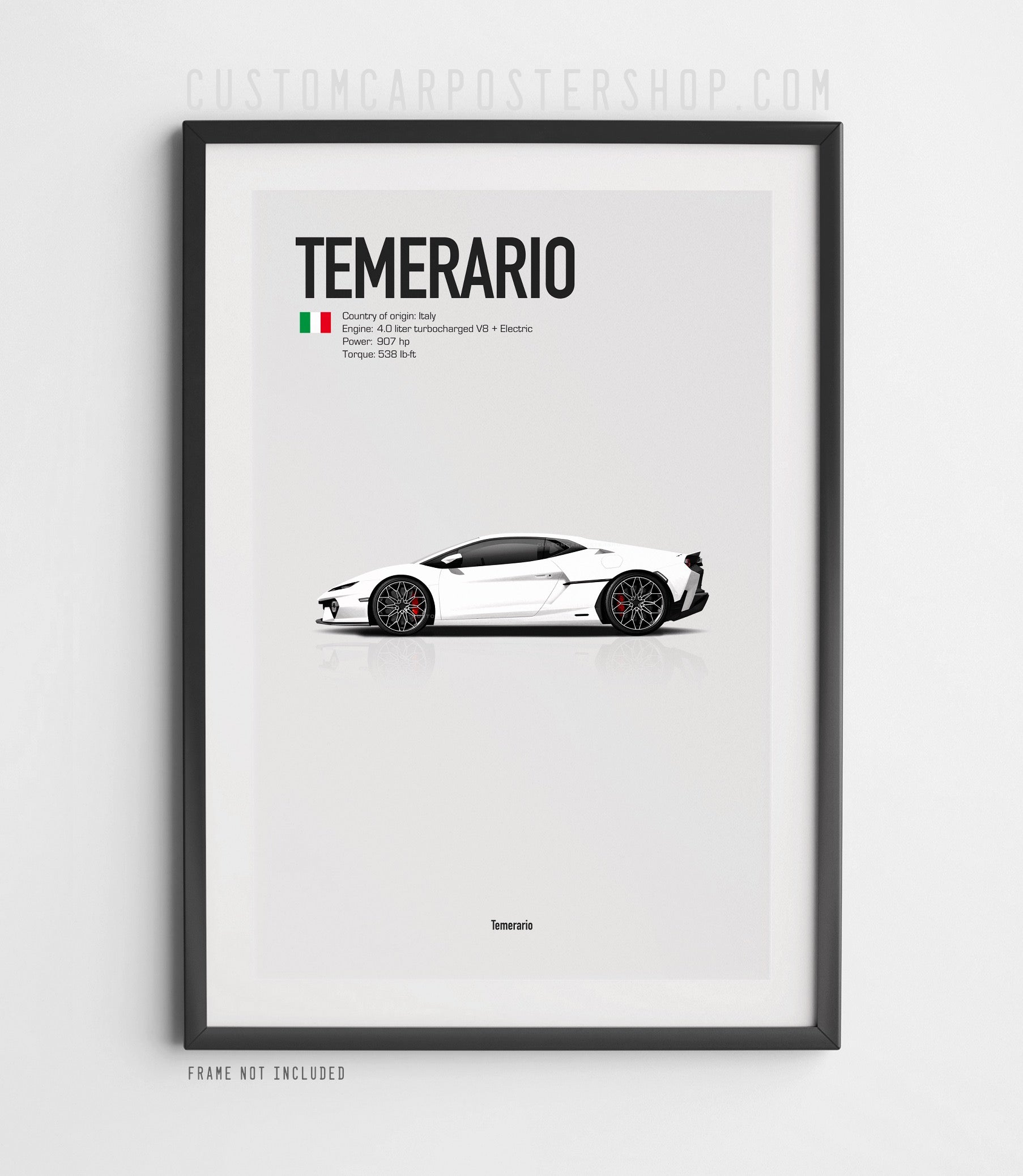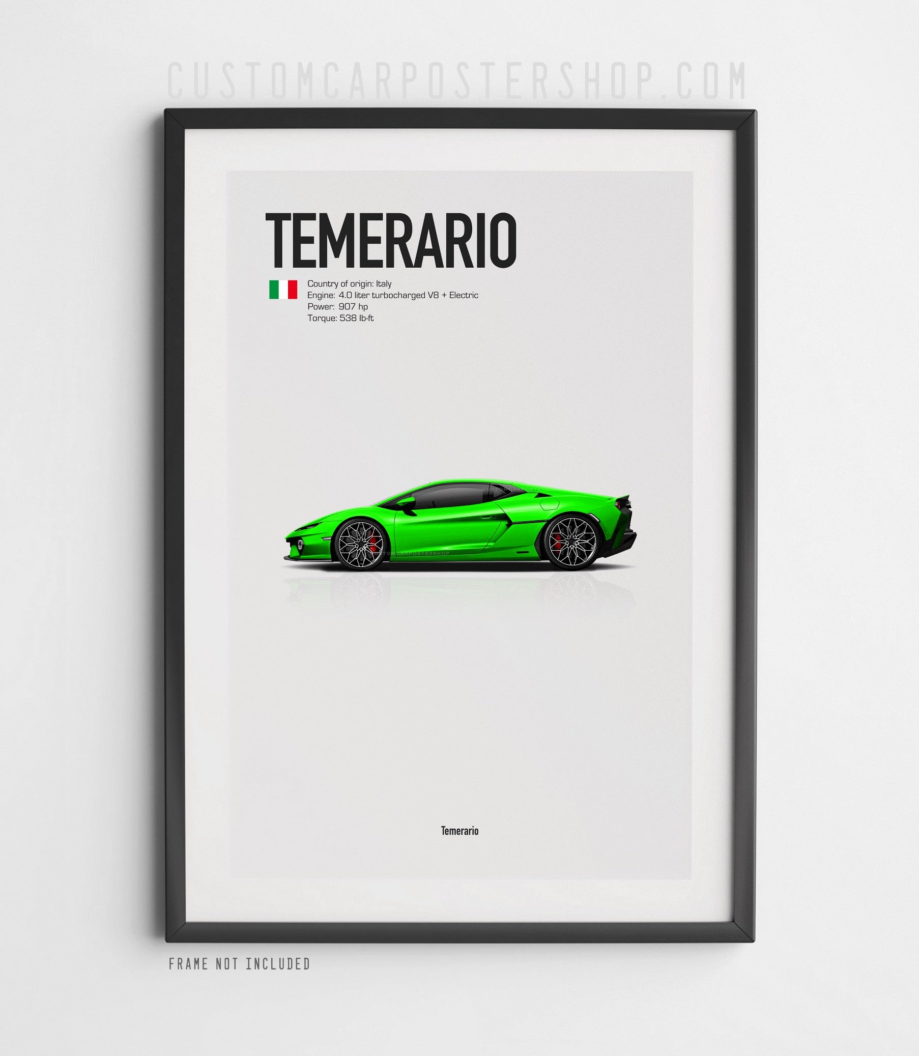 This print celebrates the recently launched 2025 Lamborghini Temerario in various colours. A 900 horsepower plugin hybrid replacement of the Huracan.