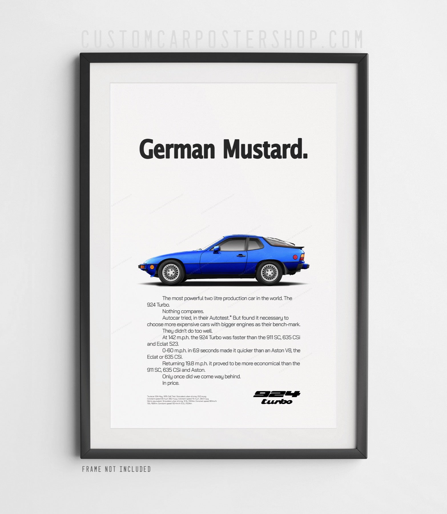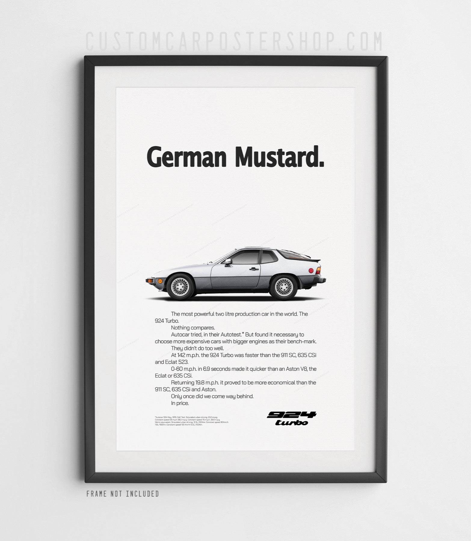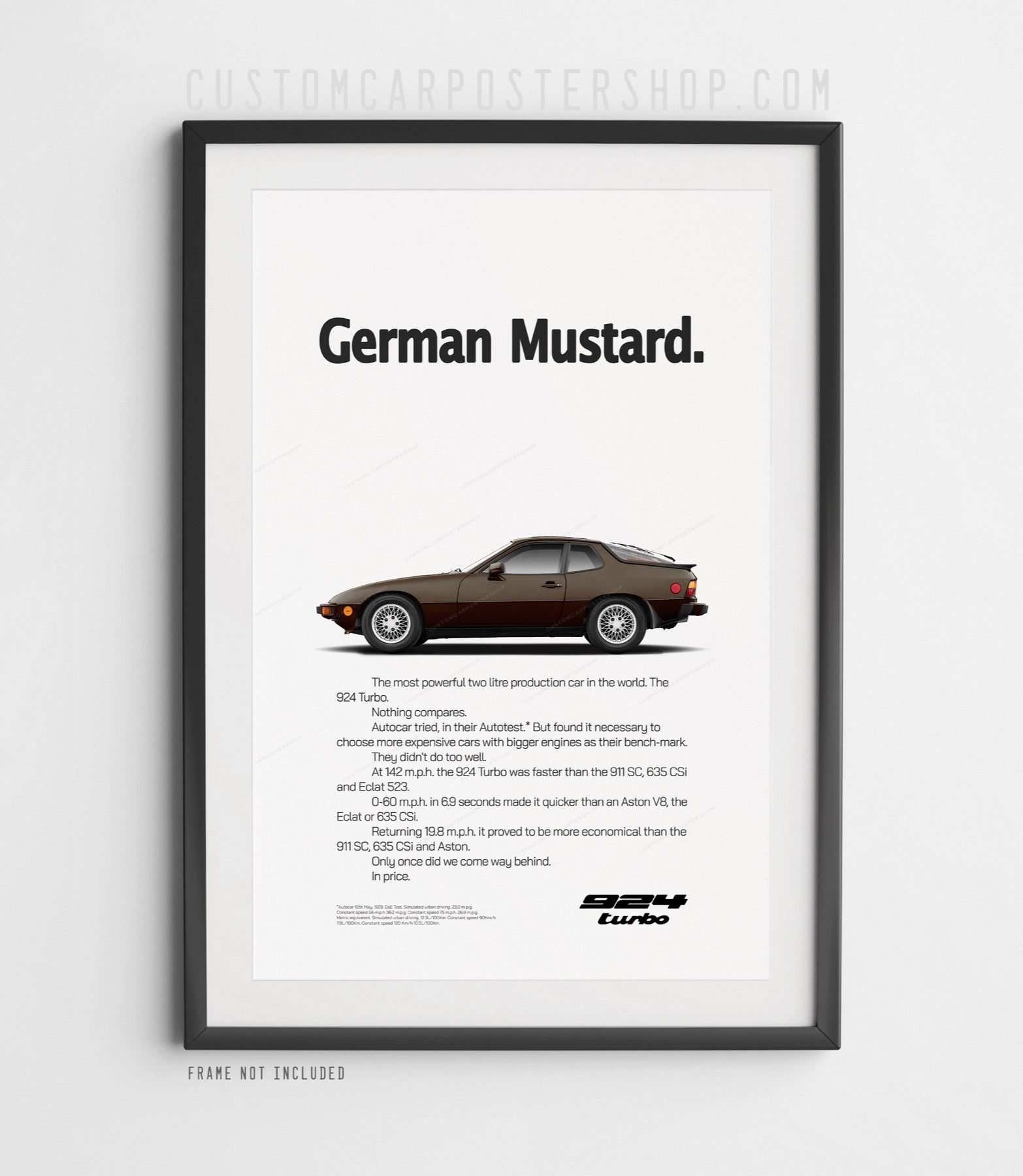 This print is a faithful remaster of the classic “German Mustard” Porsche 924 Turbo advertisement, celebrating one of Porsche’s most distinctive 1980s icons.