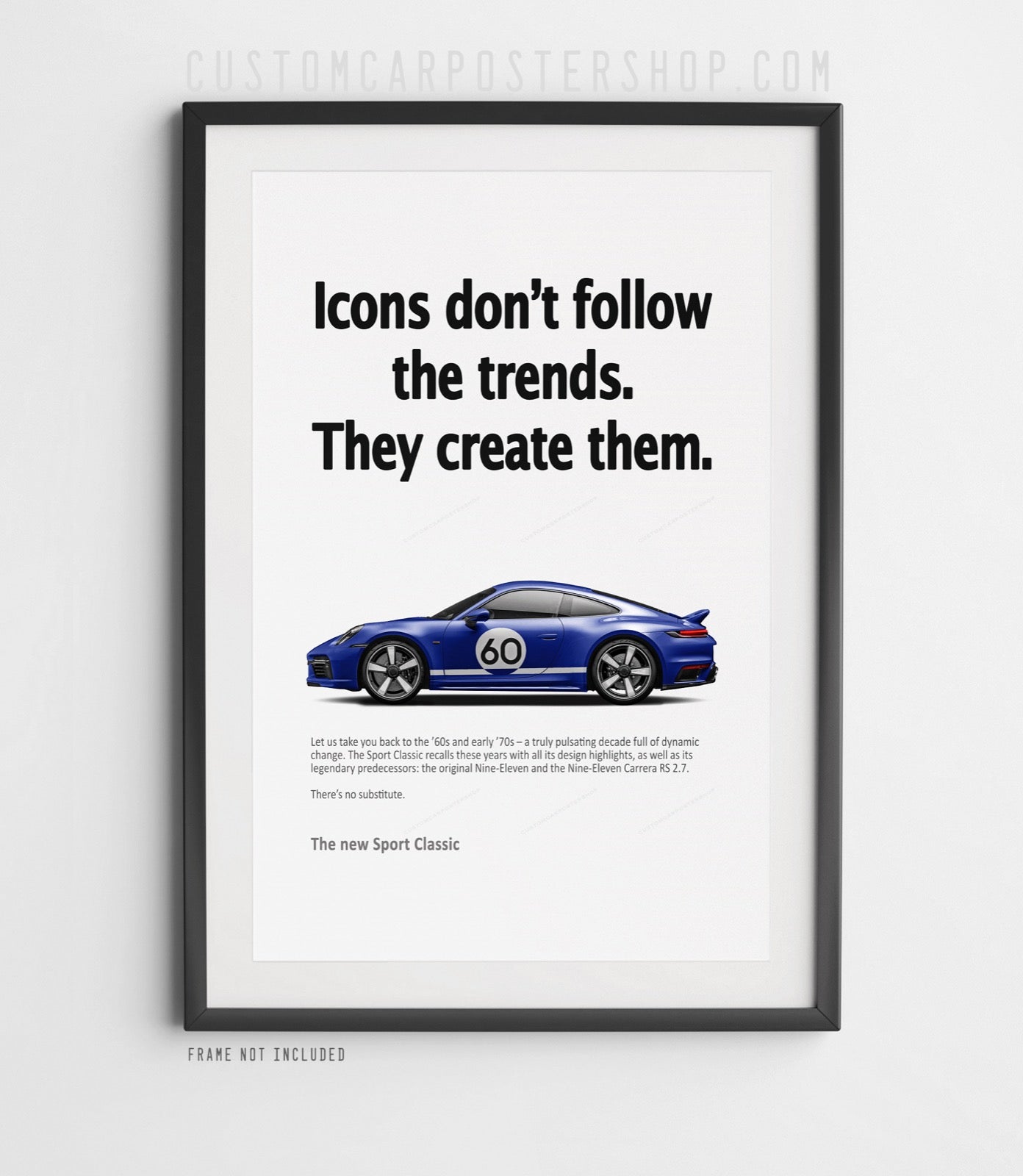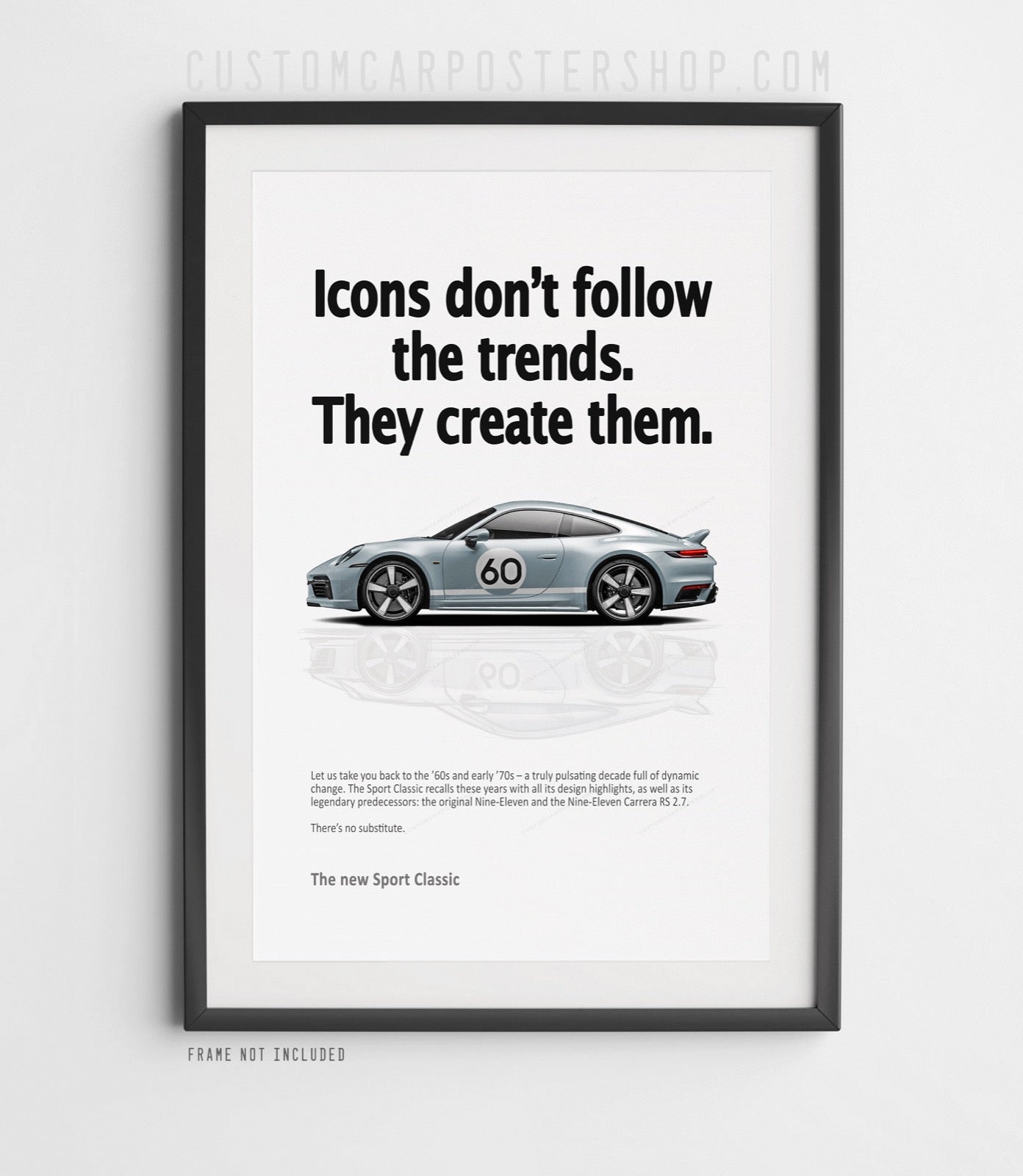 This is an imaginary rendition poster print of the Porsche "Icons" advertisment of the 992 Sport Classic.