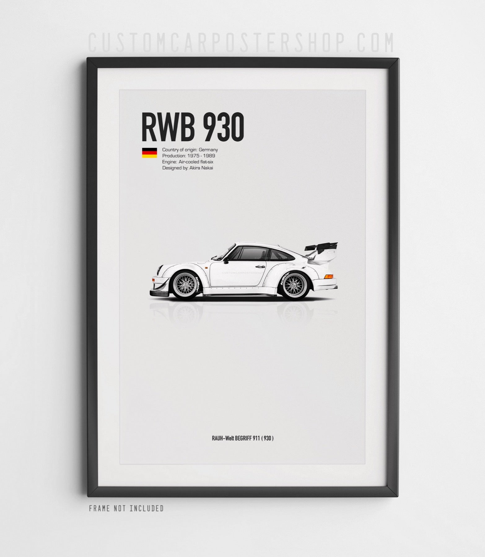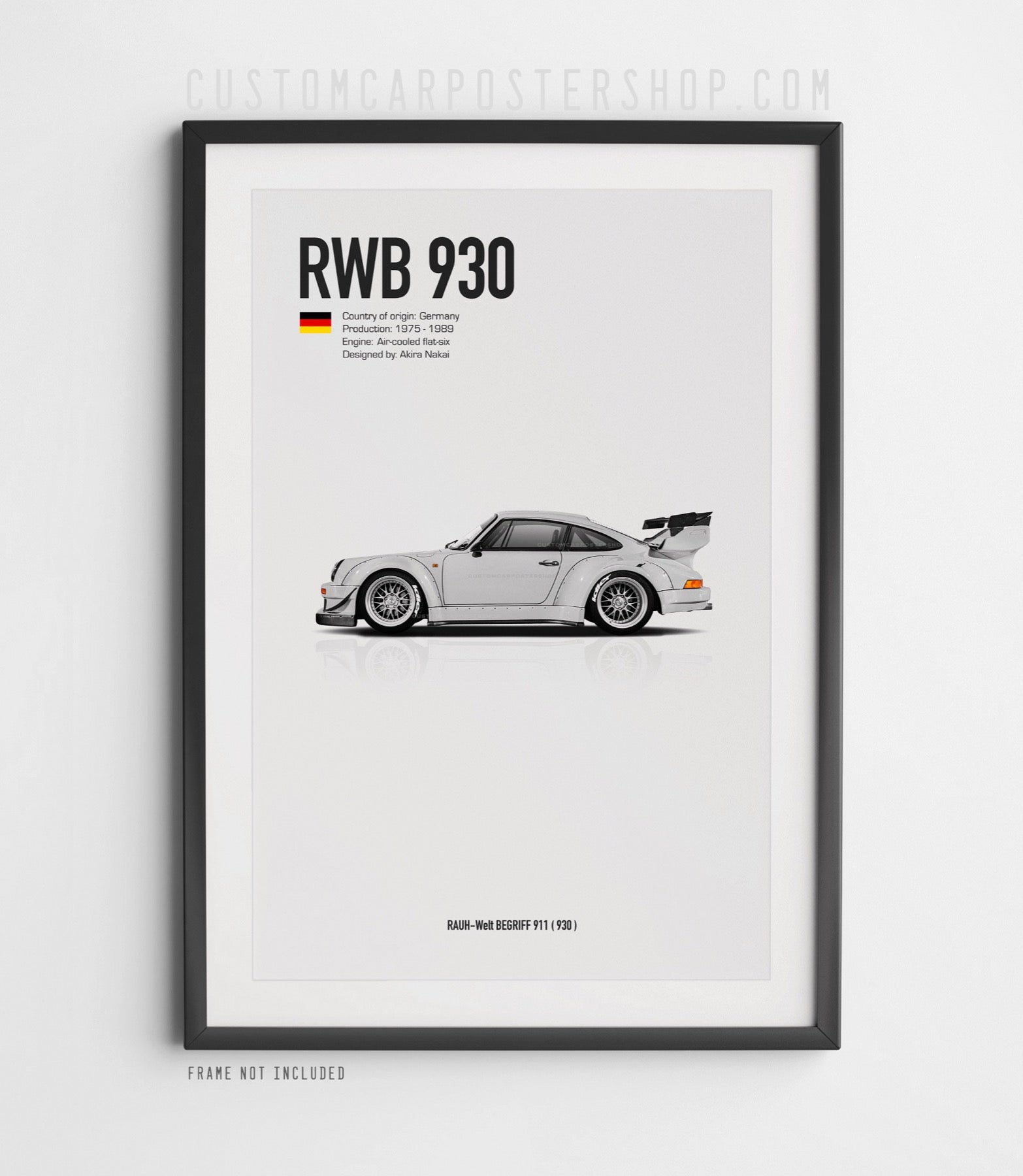 This poster features the RWB Porsche 911 (930) — a legendary widebody creation handcrafted by Akira Nakai (Nakai-San) of Rauh-Welt Begriff.