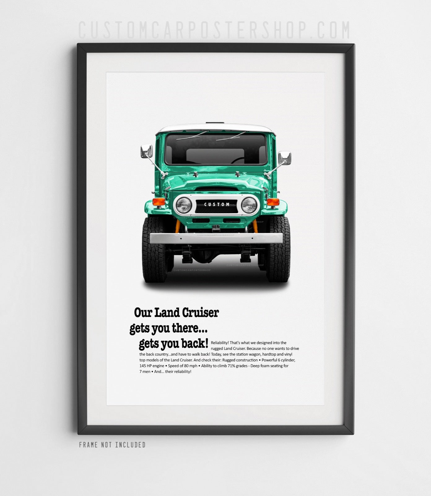 This is a "Gets You Back" reproduction print ad of the Toyota FJ40 with lots of colour choices.