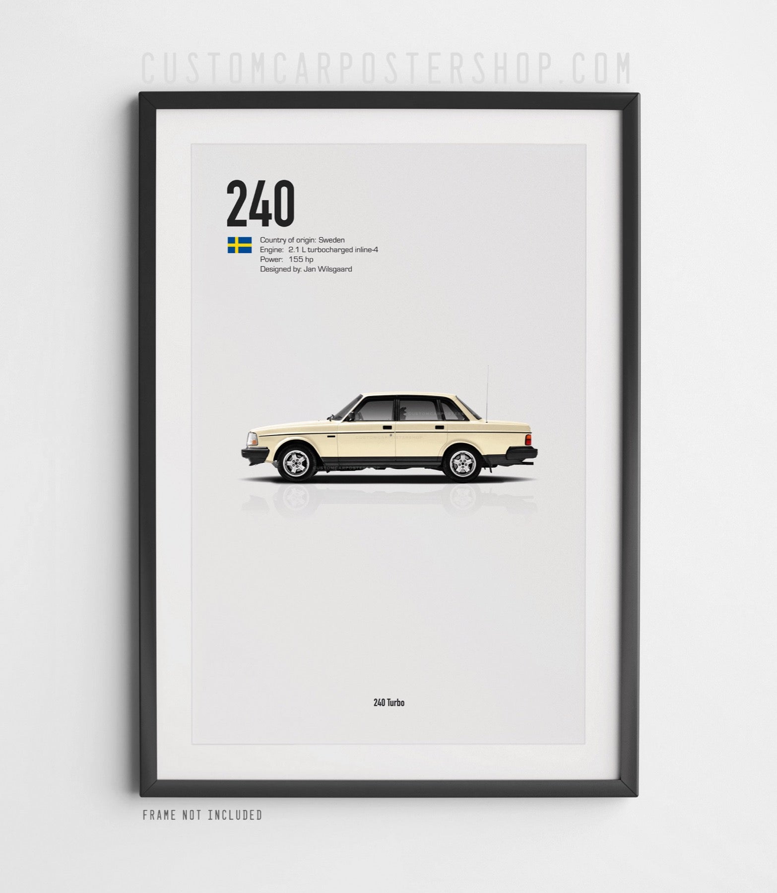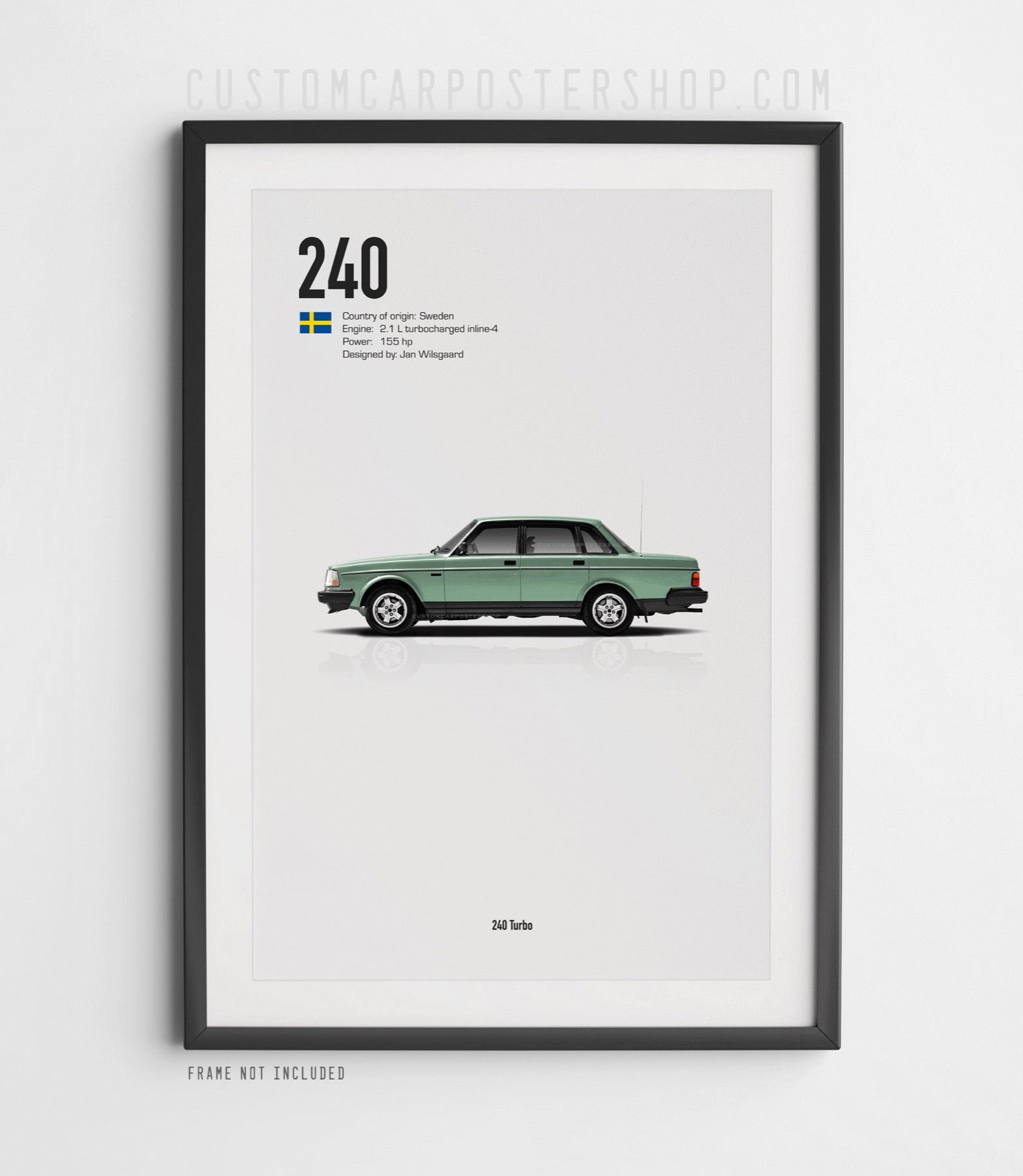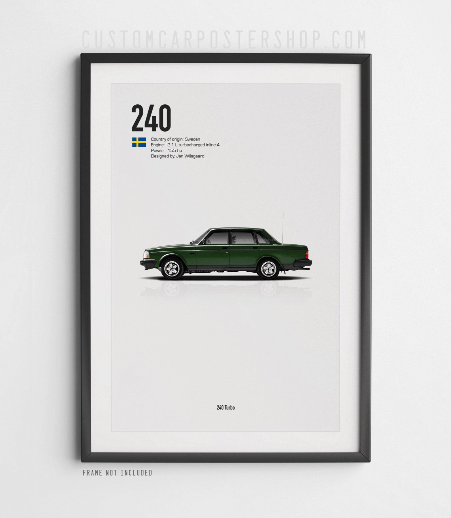 A cult classic from Sweden, this Volvo 240 Turbo Sedan poster features a clean, minimalist side profile of the iconic 240 Turbo, paired with key specifications including its 2.1L turbocharged inline-4 engine and heritage-driven design by Jan Wilsgaard.